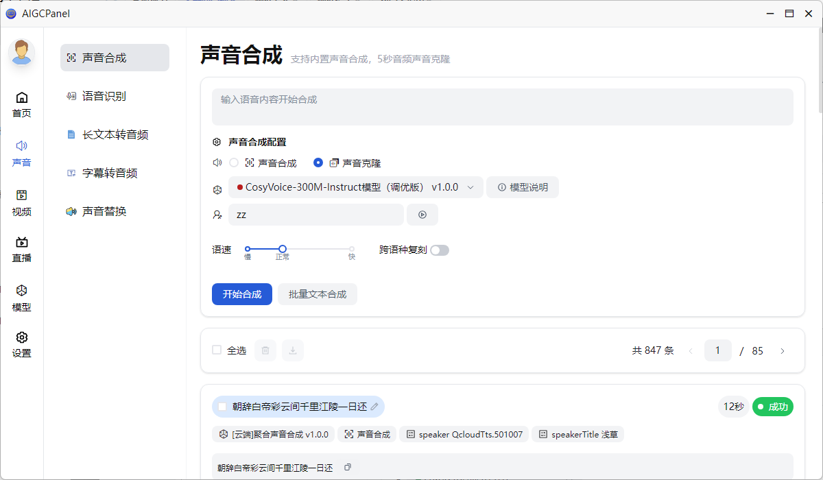 支持语音合成、语音克隆、声音替换,多种声音参数可设置