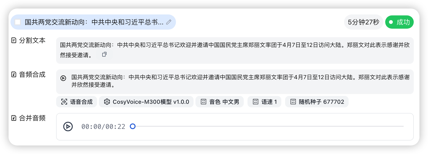 文本太长了吧,mac M4芯片 实测60多字转音频需要5分27秒,不是太快,你这字数太多估计慢了卡住了
